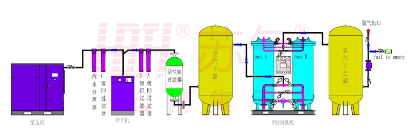 環(huán)境空氣經(jīng)壓縮凈化,除去油、水、塵后,進(jìn)入由兩個(gè)裝填有碳分子篩的吸附塔組成的變壓吸附裝置。壓縮空氣由下至上流經(jīng)吸附 塔,其間氧分子在碳分子篩表面吸附,氮?dú)庥晌剿隙肆鞒?,進(jìn)入粗氮緩沖罐,經(jīng)過(guò)一段時(shí)間后,吸附塔中碳分子篩被吸附的氧飽和,需進(jìn)行再生。再生是通過(guò)停止吸附步驟,降低吸附塔壓力來(lái)實(shí)現(xiàn)的。兩個(gè)吸附塔交替進(jìn)行吸附和再生,從而確保氮?dú)獾倪B續(xù)輸出。